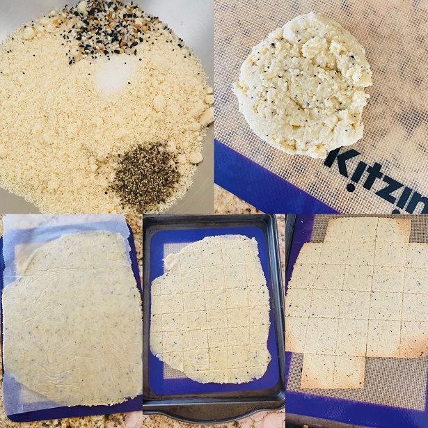 Anyway, the almond flour crackers are the basic recipe where you combine almond flour, egg, salt, pepper. Add everything seasoning to take it to the next level and you will not regret one bit to try it.